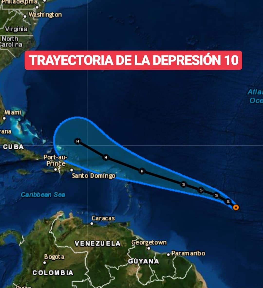 Esta es la trayectoria establecida por el Centro Nacional de Huracanes de Miami para la Depresión Tropical 10: la proyección actual es que pase al norte de las Antillas Menores el viernes, al norte de Puerto Rico el sábado y al norte de República Dominicana el domingo.